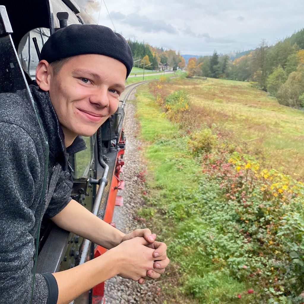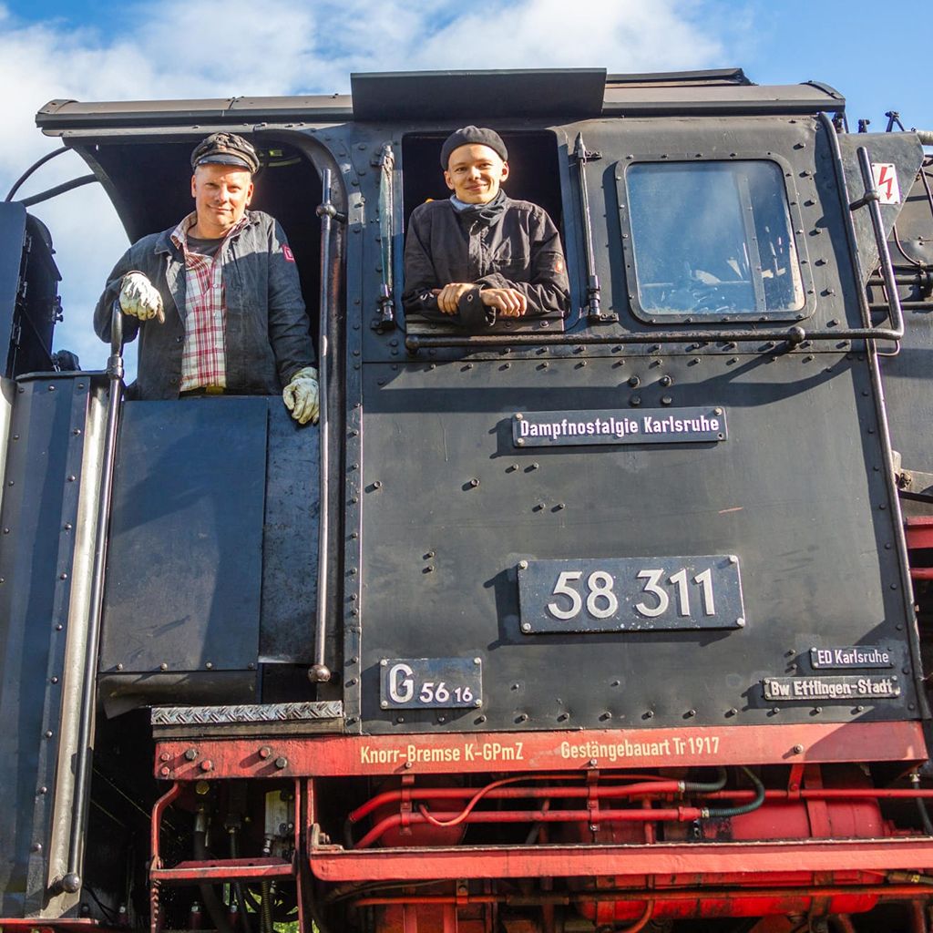 An seiner Schirmmütze, roten Zugführer-Binde, Fertigmeldescheibe und dampfenden Schweif ist es sofort zu erkennen. Der Name kommt von der Geburtsstadt unserer Dampflok 58 311: Karls-Ruhe.