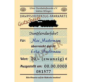 können ausschließlich für den Erwerb von Fahrkarten bei der Dampfnostalgie Karlsruhe eingelöst werden (auch Fern- und Sonderfahrten).